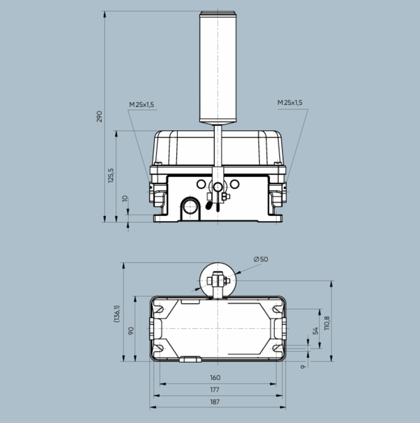 Cable entry (included in scope of delivery) | 2 x M25 x 1,5 with red transport lock 1x screwed cable gland: sealing area ∅ 10 mm to ∅ 17 mm; 1x dummy screw |