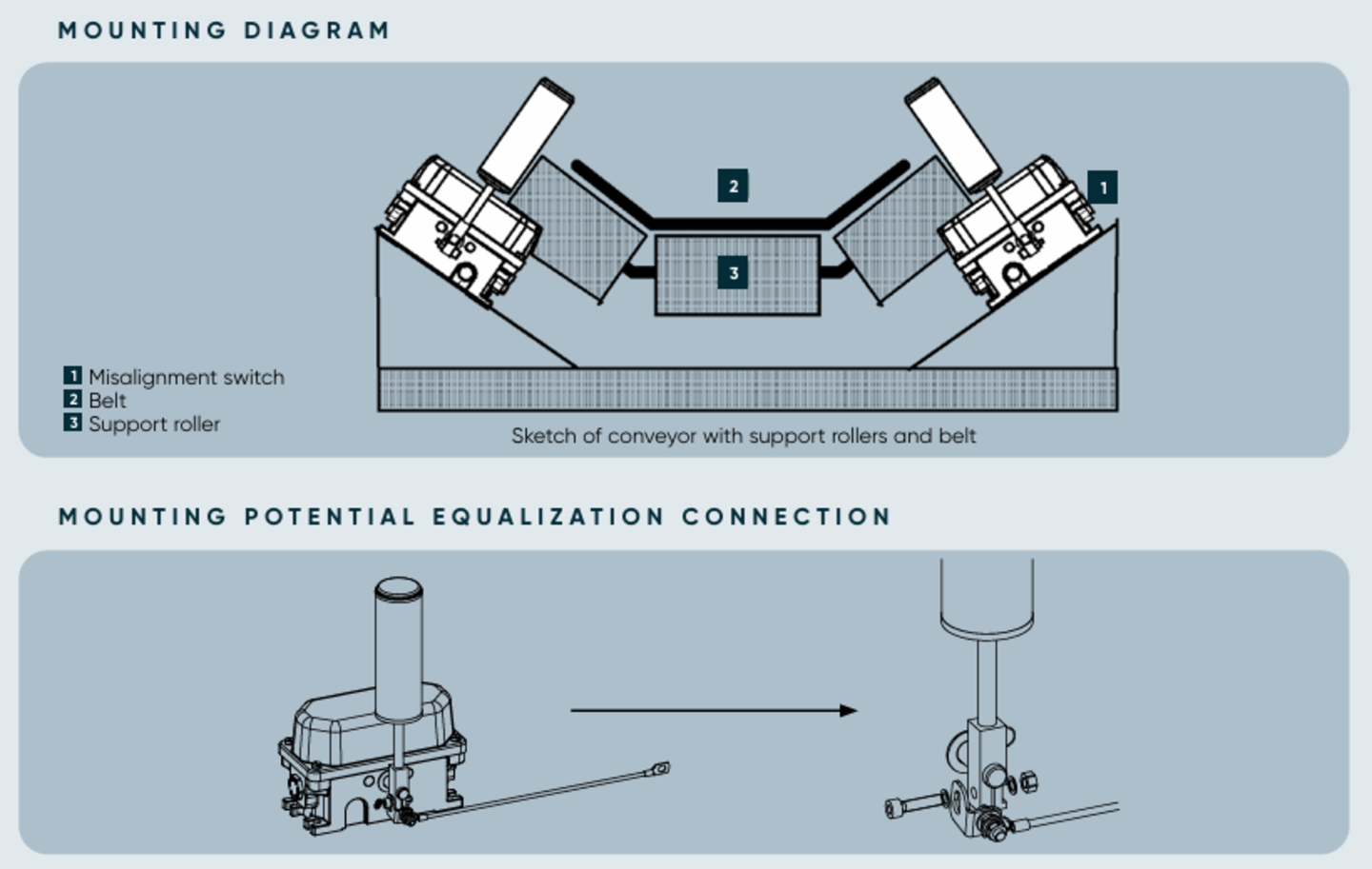 KIEPE belt misalignment switches type SLS EX are used to monitor the misalignment of conveyor belt systems in accordance with the requirements of EN 620. They are used to protect the system from damage or destruction in the event of belt misalignment and are installed in pairs on both sides of the upper or lower run in areas at risk. The ball-bearing roller lever made of alloy steel and with a large roller diameter is resistant to wear that occurs when the moving belt touches the roller.The KIEPE misalignment switches Type SLS EX are suited for use in explosive atmosphere with conductive dust, Group II, category 2 , in zone 21 and 22 (Type SLS EX 2D) or categorie 3, only in zone 22 (Type SLS EX 3D).The Kiepe misalignment switch Type SLS EX complies with the ATEX Directive 2014/34/EU and meets the safety objectives of the Low Vol-tage Directive 2014/35/EU and IECEx.KIEPE Misalignment switch Type SLS EX features a robust thermoset (BMC) housing and is equipped with 4 force-actuated changeover contacts with snap-action function with two settable switching points.