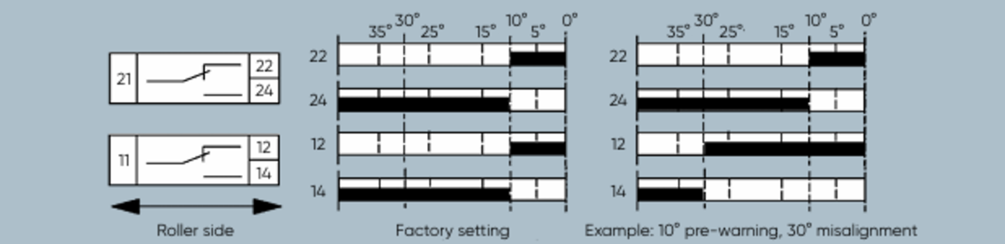 The misalignment switch type SLS EX switches when the actuating roller is approached and deflected by the misaligned conveyor belt in the direction of rotation of the roller lever. The stainless steel roller lever is mounted on ball bearings, making it better able to absorb lateral forces and impacts. The switching angle can be set for each switching contact using an adjustable roller. In addition to the safety cut-out, this also enables an advance warning to be realized. When the belt is running correctly, the roller lever resets itself automatically.
