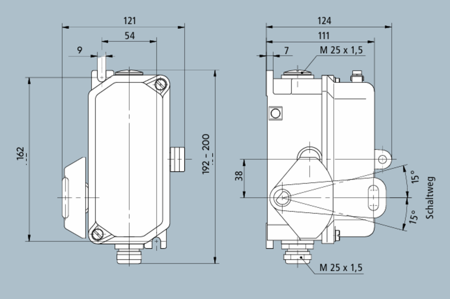 Cable entry (included in scope of supply) | 2 x M25 x 1,5, with red transport lock (1x screwed cable gland: sealing area Ø 10 mm to Ø 17 mm; 1x dummy screw) |