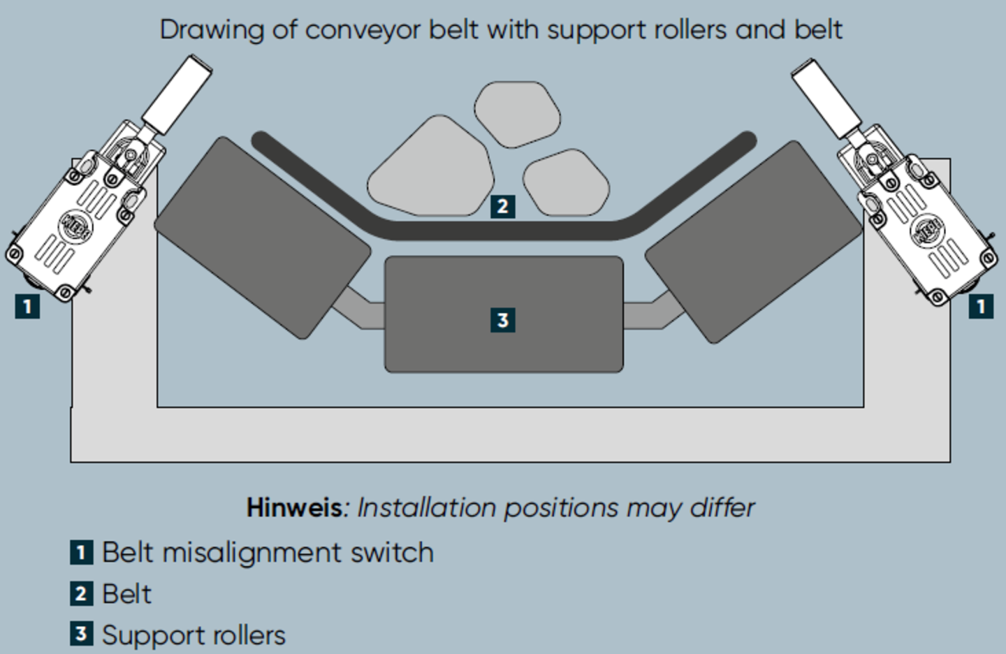 Misalignment switches of type VG [1] are fastened in pairs to a substructure with 2 M6 screws each. In the event of misalignment, the belt [2] must not leave the lateral support rollers [3]. The position of the belt misalignment switches must be selected so that the actuating roller of the belt misalignment switch is preferably approached vertically by the belt [2] . During normal operation, the actuating roller of the belt misalignment switch is not touched. The roller lever is interchangeable and can be freely fixed in the directions of rotation on the switch axis. The head with the roller lever can also be mounted in 90° steps on type VG. This provides more positioning options. The electrical connection is made when the device is open via the cable gland included in the scope of delivery directly to the connection glands of the switching elements.