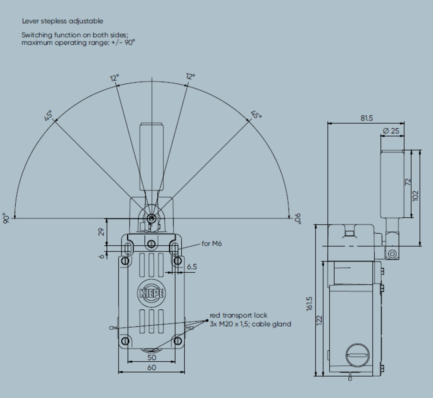 The misalignment switch type VG switches when the actuating roller is approached and deflected by the misaligned conveyor belt in the direction of rotation of the roller lever. The actuating roller is made of polyamide. The switching angles are fixed. The switching point for all switch types is approx. 12° deflection. Switch variants with pre-warning have two switching points at approx. 12° and 45°. This means that a pre-warning can be realized in addition to the safety shutdown. When the belt runs correctly, the roller lever resets automatically. The switches of types VG .../6 engage when the permissible deflection is exceeded. Unlocking is achieved on site by resetting the actuating roller.
