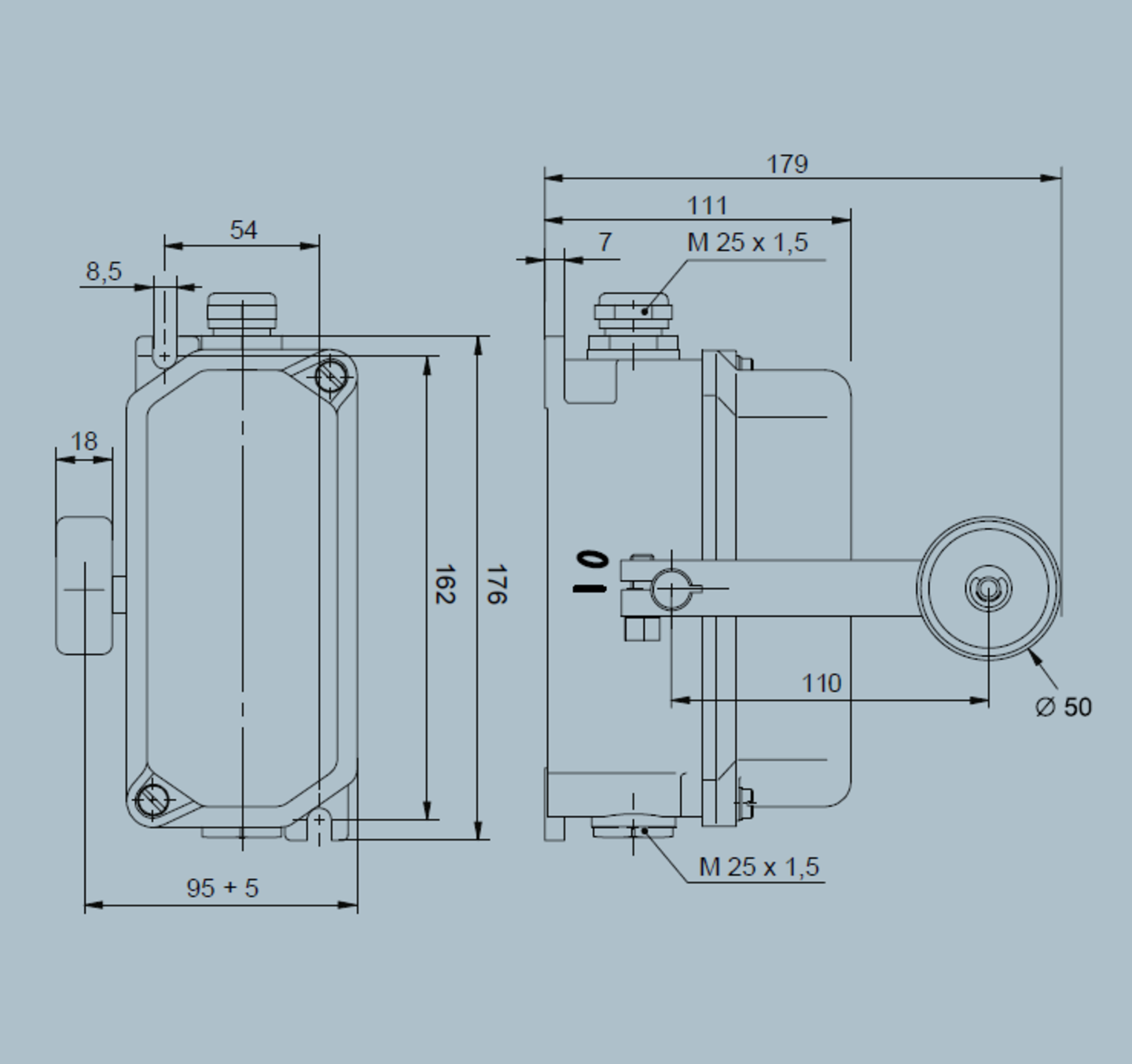 Cable entry (included in scope of delivery) | Threaded holes 2x M25x1,5 with each 1x screwed cable gland: sealing area ∅ 9 mm to ∅ 17 mm; 1x dummy screw |