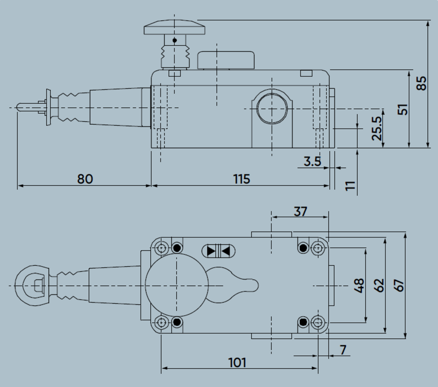 Der Kiepe LRS 0xx ist ein kompakter Seilzugnotschalter mit integrierter Schlaffseilerkennung und Verrastung. Mit einem Schalter kann ein Not-Halt-Signal durch Zug oder Entspannung der Reißleine auf einer Strecke von bis zu 75m ausgelöst werden. Ein Sichtfenster im Deckel erleichtert die Kontrolle der Betriebsposition. In dieser Position kann der Schalter über den Rückstellhebel wieder zurückgesetzt werden.