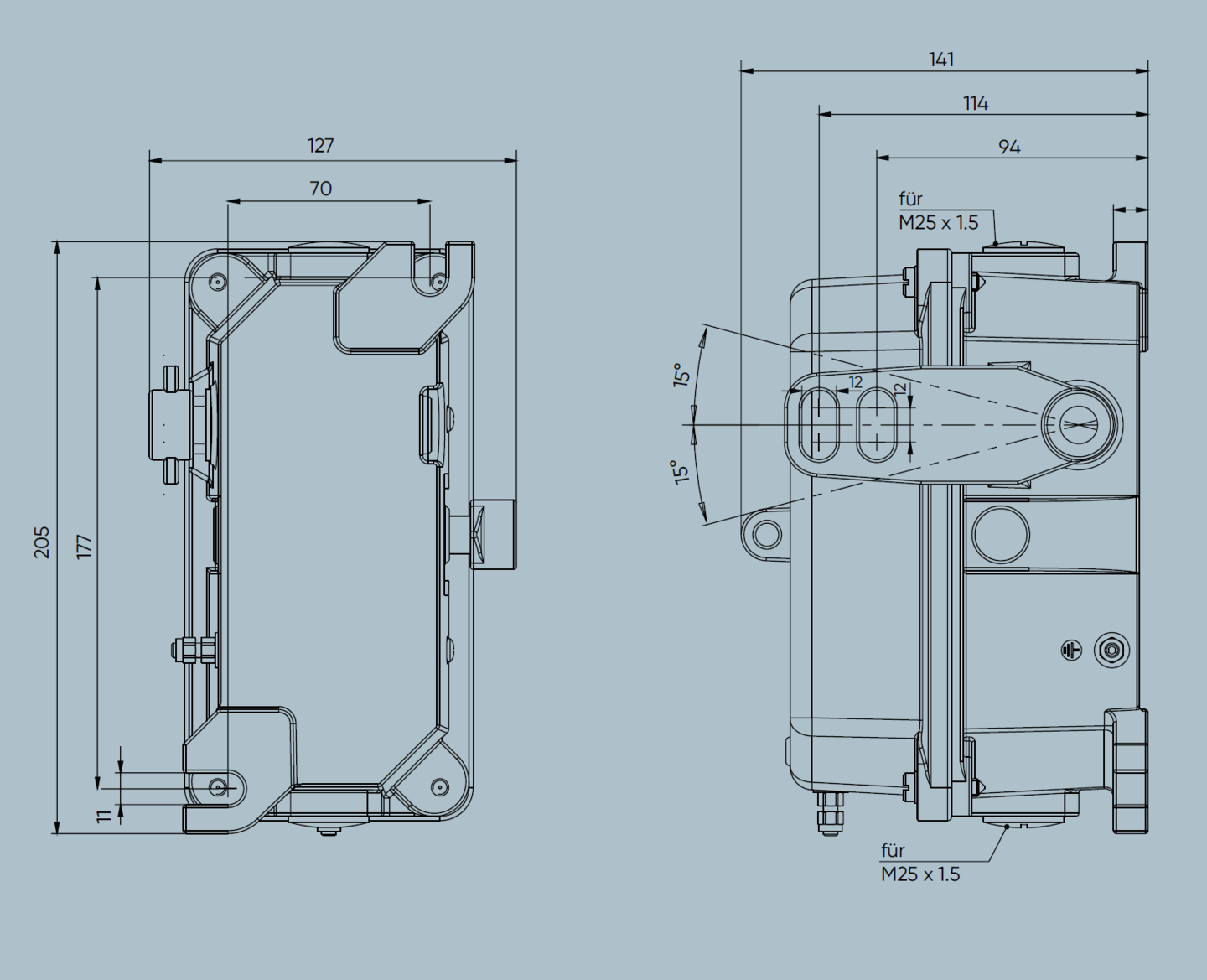 Cable entry (included in scope of supply) | 2 x M25 x 1,5, with red transport lock (1x screwed cable gland: sealing area Ø 11 mm to Ø 16 mm; 1x dummy screw) |