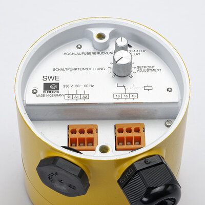The device has a separate connection chamber in which the connection terminals, the potentiometers for setting the switching points and the start-up delay as well as the LED for the operating display are located. The time for the start up delay can be set from 0.5 to 15 seconds. If the drive speed exceeds the pre-set operating speed, the relay is energized and the LED is lit. If the drive speed falls below the pre-set operating speed, the relay drops. The LED is extinguished.