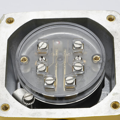 Kiepe SW standstill monitors are electromechanical devices that do not require a power supply. The drive shaft [1] drives the hermetically sealed fluid coupling [4] [5] via the magnetic coupling [2] [3] . This actuates the respective contact spring set [6] for clockwise or anticlockwise rotation. As the drive speed increases, so does the torque generated in the fluid coupling. If the torque is greater than the counteracting preload force of the factory-set contact springs, the contact is switched over. A further increase in the drive speed increases the contact pressure only slightly, as the torque of the fluid coupling is stabilized by the slip of the magnetic coupling. If the speed drops, the contact switches back when the preload of the contact springs becomes greater than the torque generated by the drive speed. The switching point setting of the standstill monitor is determined by the viscosity of the oil in the fluid coupling and by the pretension of the contact spring sets. The set switching speeds have a tolerance of +/- 30% depending on the ambient temperature and the operating temperature. Contact is made gradually. The operating speed must therefore be higher than the switching speed to ensure contact reliability. Due to their design, standstill monitors with very low switching points have an advantageous switching delay of approx. 2 seconds. The standstill monitors are single-mechanical devices. They must be protected by suitable design measures. If speeds greater than 500 rpm are to be monitored, the use of our electronic speed monitors is recommended.