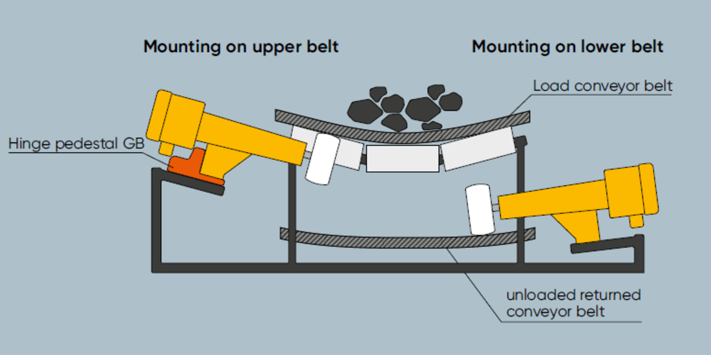 Standstill monitors type SWB are attached to the substructure of the monitored machine using 4 M6 screws each. This is done using flange (F1, F2) or fixing foot F4. The connection to the rotating shaft is made using couplings (K1, K6, K7) depending on the SWB shaft version. When the speed is taken directly from the belt, the SWB is attached to the belt drive B. The belt drive is pressed against the cleaned side of the belt using a hinge pedestal GB. The electrical connection is made when the device is open via the cable gland included in the scope of delivery directly to the accessible connection screws (see connection drawing, 1,2,P or 3,4,P) of the potential-free changeover contacts of the SWB.