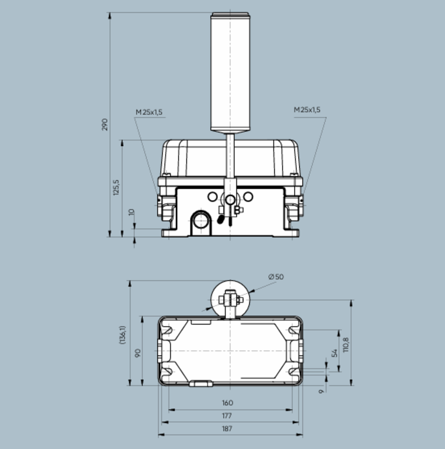 Leitungseinführung | 2 x M25 x 1,5; mit roter Transportsicherung verschlossen (1x Kabelverschraubung; Dichtbereich Ø 10mm bis Ø 17mm; 1x Verschlussschraube) |
