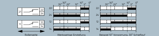 Schaltbereich | 2x 12,5°, einstellbar +/-10° 2x 18°, fix |