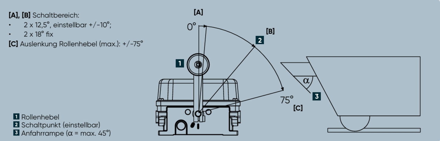 Betätigungsart | Bidirektional (zweiseitig wirkend) über Rollenhebel |