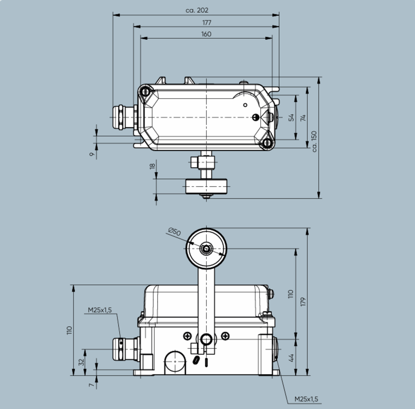 Der Endschalter Typ HER EX schaltet, wenn die Betätigungsrolle in Drehrichtung des Rollenhebels vom Maschinenteil angefahren und ausgelenkt wird. Der Schaltwinkel kann je Schaltkontakt durch eine einstellbare Nockenwalze eingestellt werden. Dadurch ist neben der Sicherheitsabschaltung auch eine Vorwarnung realisierbar. Bei Rückstellung des Maschinenteils stellt sich der Rollenhebel wieder selbsttätig zurück.