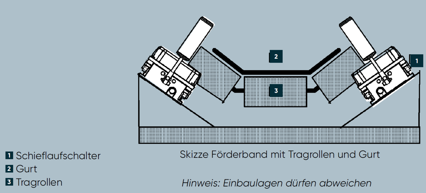 Schieflaufschalter vom Typ SEL [1] werden mit je 2 M10 Schrauben auf einer Unterkonstruktion befestigt. Bei einem Schieflauf darf der Gurt [2] die seitlichen Führungsrollen [3] nicht verlassen. Die Position der Schieflaufschalter ist so zu wählen, dass die Betätigungsrolle desSchieflaufschalters vom Gurt [2] vorzugsweise senkrecht angefahren wird. Bei normalem Betrieb wird die Betätigungsrolle des Schieflaufschalters nicht berührt. Der Rollenhebel ist austauschbar und kann in den Drehrichtungen auf der Schalterachse frei fixiert werden. Der elektrische Anschluss erfolgt bei geöffnetem Gerät über die im Lieferumfang enthaltene Kabelverschraubung direkt an den Anschlussverschraubungen der Schaltelemente.