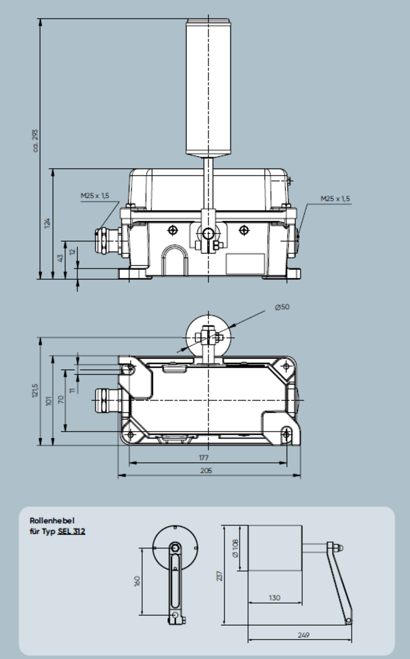 Der Schieflaufschalter Typ SEL schaltet, wenn die Betätigungsrolle in Drehrichtung des Rollenhebels vom schieflaufenden Förderband angefahren und ausgelenkt wird. Der Rollenhebel aus Edelstahl ist kugelgelagert, daher kann er Querkräfte und Stöße besser aufnehmen.