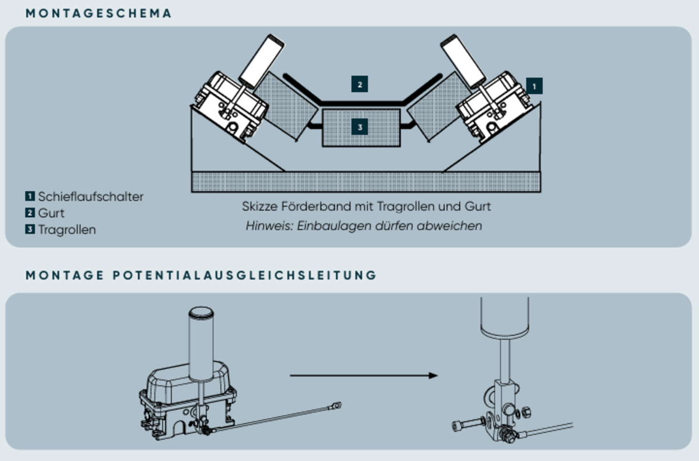 Schieflaufschalter vom Typ SLS [1] werden mit je 4 M8 Schrauben auf einer Unterkronstruktion in Einbaulage befestigt. Bei einem Schieflauf darf der Gurt [2] die seiltlichen Führungsrollen [3] nicht verlassen. Die Position der Schieflaufschalter ist so zu wählen, dass die Betätigungsrolle des Schieflaufschalters vom Gurt [2] vorzugsweise senkrecht angefahren wird. Bei normalem Betrieb wird die Betätigungsrolle des Schieflaufschalters nicht berührt. Der Rollenhebel ist austauschbar und kann in den Drehrichtungen auf der Schalterachse frei fixiert werden. Der elektrische Anschluss erfolgt bei geöffnetem Gerät über die im Lieferumfang enthaltene Kabelverschraubung direkt an den Anschlussverschraubungen der Schaltelemente.