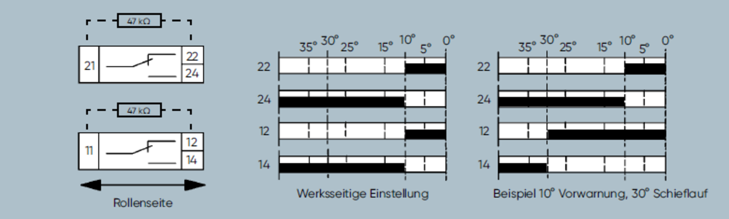 Der Schieflaufschalter Typ SLS schaltet, wenn die Betätigungsrolle in Drehrichtung des Rollenhebels vom schieflaufenden Förderband angefahren und ausgelenkt wird. Der Rollenhebel aus Edelstahl ist kugelgelagert, daher kann er Querkräfte und Stöße besser aufnehmen. Der Schaltwinkel kann je Schaltkontakt durch eine einstellbare Nockenwalze eingestellt werden. Dadurch ist neben der Sicherheitsabschaltung auch eine Vorwarnung realisierbar. Bei korrektem Bandlauf stellt sich der Rollenhebel wieder selbsttätig zurück.