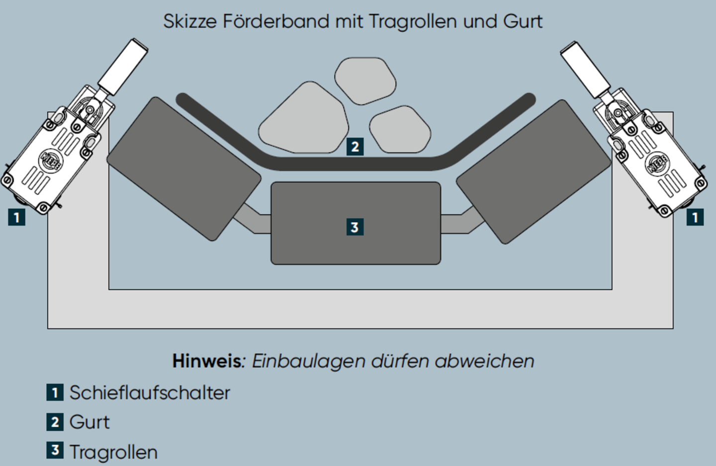 Schieflaufschalter vom Typ VG [1] werden mit je 2 M6 Schrauben auf einer Unterkronstruktion paarweise befestigt. Bei einem Schieflauf darf der Gurt [2] die seitlichen Führungsrollen [3] nicht verlassen. Die Position der Schieflaufschalter ist so zu wählen, dass die Betätigungsrolle des Schieflaufschalters vom Gurt [2] vorzugsweise senkrecht angefahren wird. Bei normalem Betrieb wird die Betätigungsrolle des Schieflaufschalters nicht berührt. Der Rollenhebel ist austauschbar und kann in den Drehrichtungen auf der Schalterachse frei fixiert werden. Der Kopf mit dem Rollenhebel kann beim Typ VG zusätzlich in 90° Schritten montiert werden. Dadurch ergeben sich mehr Positioniermöglichkeiten. Der elektrische Anschluss erfolgt bei geöffnetem Gerät über die im Lieferumfang enthaltene Kabelverschraubung direkt an den Anschlussverschraubungen der Schaltelemente.