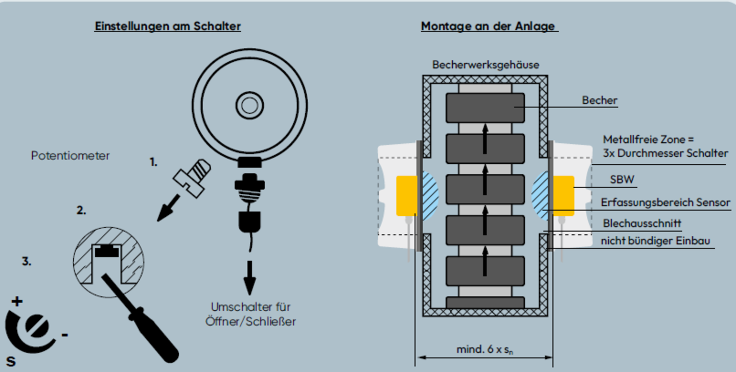 In der Funktion als Becherwerksschieflaufsschalter werden die SBW auf einer Montageplatte aus Kunststoff jeweils paarweise vor der Antriebs- bzw. vor der Umlenktrommel angebracht. In die Becherwerkswand muss dazu eine Einbauöffnung geschnitten werden. Für eine optimale Nutzung des Schaltabstandes sollte diese Öffnung der angegebenen metallfreien Zone entsprechen. Bei kleineren Öffnungen reduziert sich die Reichweite. Die Schalter müssen so angeordnet sein, dass ihre aktive Sensorfläche von den vorbeilaufenden Metallbechern voll bedämpft wird. Bei Bechern mit konischen Seitenwänden reduziert sich der Schaltabstand. Die in der nachfolgenden Tabelle angegebenen Korrekturfaktoren des Schaltabstandes beziehen sich auf eine vollständige Bedämpfung des Schalters. Die Schalter werden werkseitig als Öffner geliefert. Nach Lösen der PG-Verschraubung und Abziehen des Anschlußkabels wird der Umschalter „Schließer - Öffner“ zugänglich.