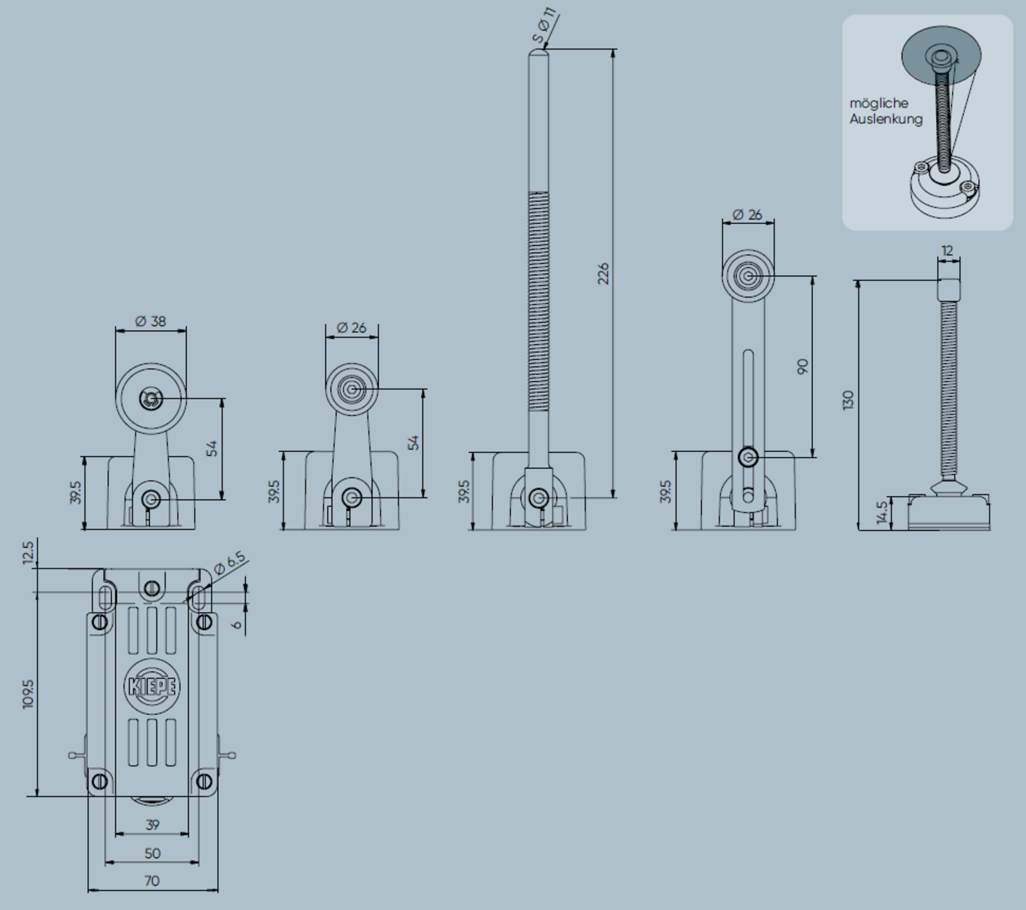 Gewicht | Schwenkhebel-Variante 0.8 kg Taumelstab-Variante 0.5 kg |