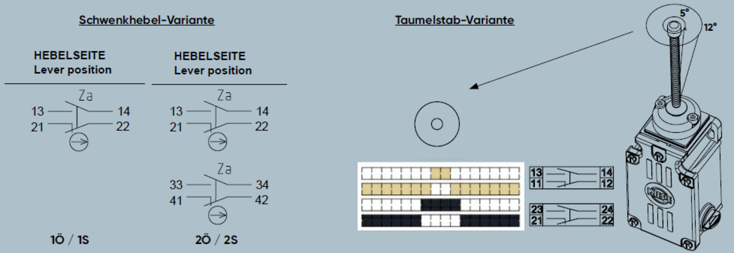Der Endschalter Typ VG schaltet, wenn die Betätigungsrolle in Drehrichtung des Rollenhebels vom Maschinenteil angefahren und ausgelenkt wird. Der Positionsschalter VG xxx/4 mit Taumelstab schaltet wenn sein Federstab entweder seitlich in jede Richtung oder auf Druck betätigt wird. Die Schaltwinkel sind fix. Eine Vorwarnung bei zwei Schaltkontakten ist realisierbar. Bei Rückstellung des Maschinenteils stellt sich der Hebel wieder selbsttätig