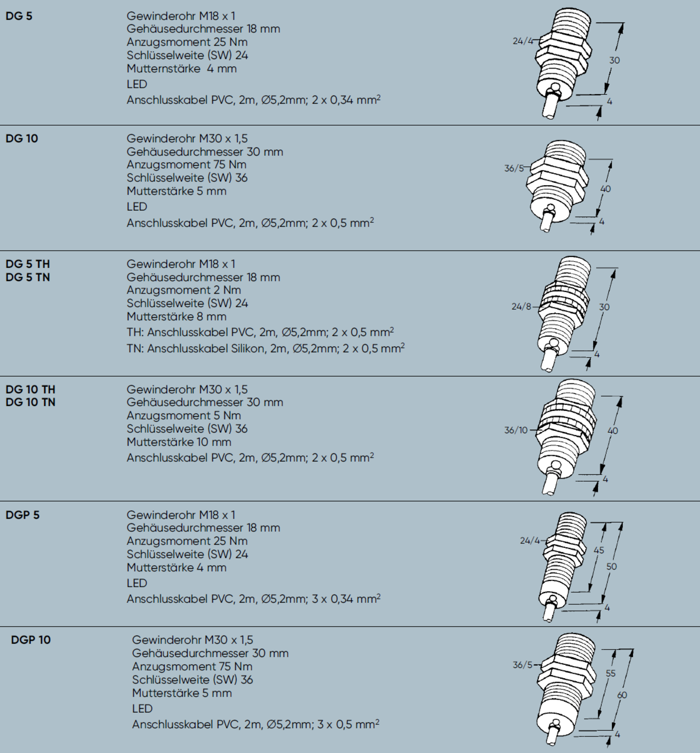 DG 10 TH (100°C) | 215.36.01.02.16 | 0.2 kg / 1 Stück | 10 mm | Namur (2-Draht) | 30 mm |