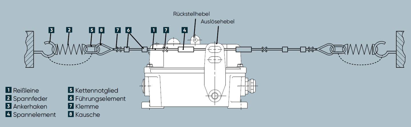 Installationslänge der Reißleine (max.) | 2 x 125m (abhängig von der Auslegung der externen Zugfedern und der max. Temperaturschwankung) |