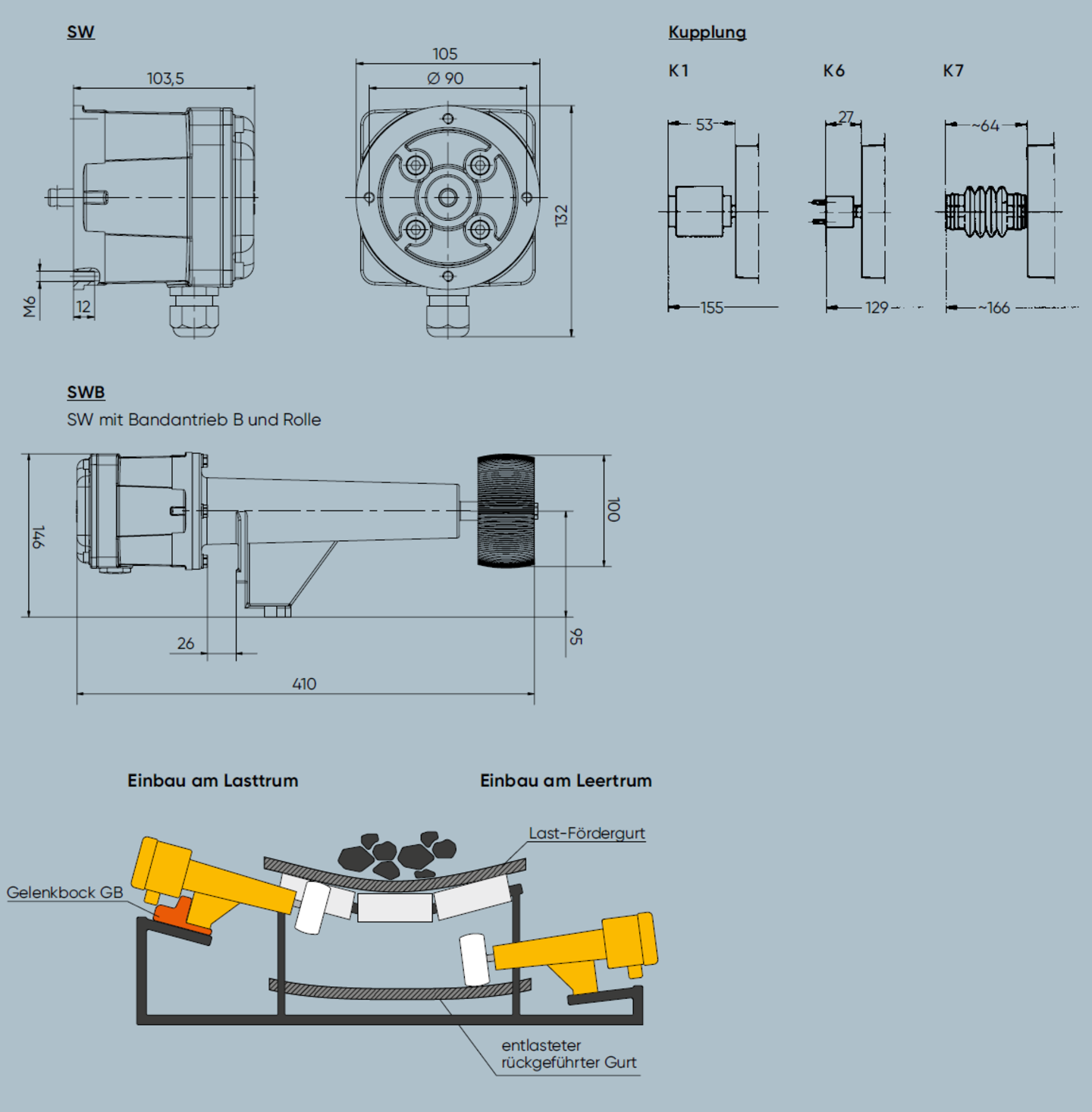 Stillstandswächster vom Typ SWB werden mit je 4 M6 Schrauben auf der Unterkonstruktion der zu überwachenden Maschine befestigt. Dies erfolgt mit Hilfe von Flansch- (F1, F2) oder Fußbefestigungen F4. Die Verbindung zur rotierenden Welle erfolgt mittels Kupplungen (K1, K6, K7) je nach Ausführung der Welle des SWs. Bei Abnahme der Geschwindigkeit direkt vom Gurt wird der SWB an dem Bandantrieb B befestigt. Der Bandantrieb wird mit einem Gelenkbock GB gegen die gereinigte Seite des Gurtes gedrückt. Der elektrische Anschluss erfolgt bei geöffnetem Gerät über die im Lieferumfang enthaltene Kabelverschraubung direkt an den zugänglichen Anschlussschrauben (siehe Anschlusszeichnung, 1,2,P oder 3,4,P) der potentialfreien Wechselkontakte des SWB.
